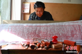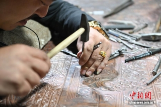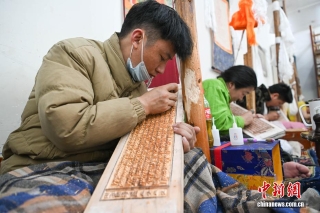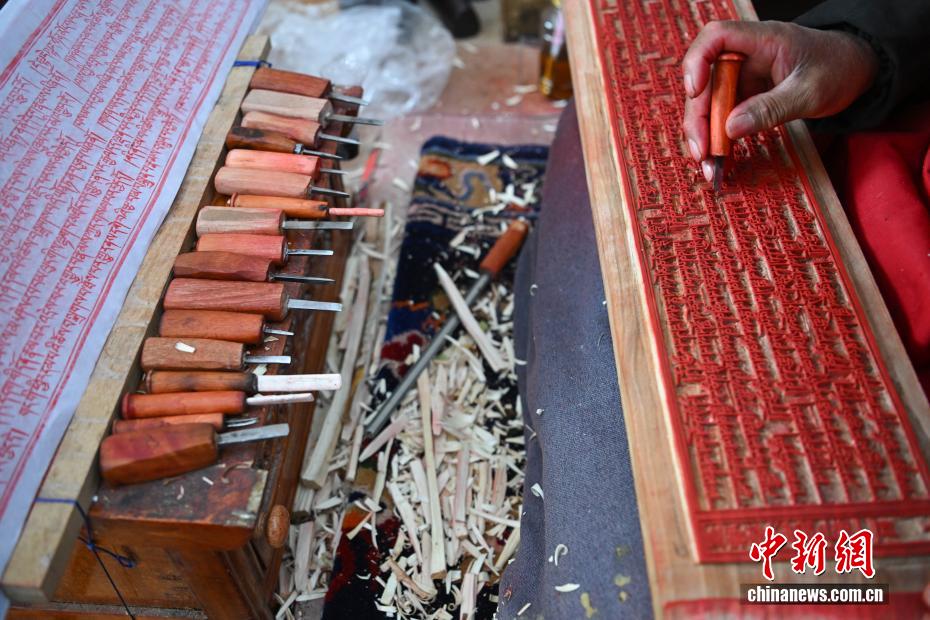 4月21日,西藏雪堆白技工学校手工艺人在雕刻印经板。中新社记者 贡嘎来松 摄