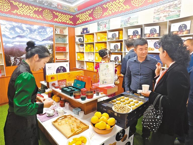 察隅县供销合作社工作人员在林芝城市会客厅内展示农特产品薏仁。记者 谢筱纯 王珊 摄