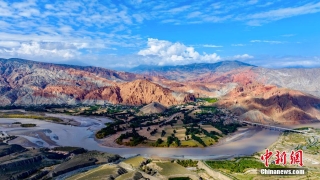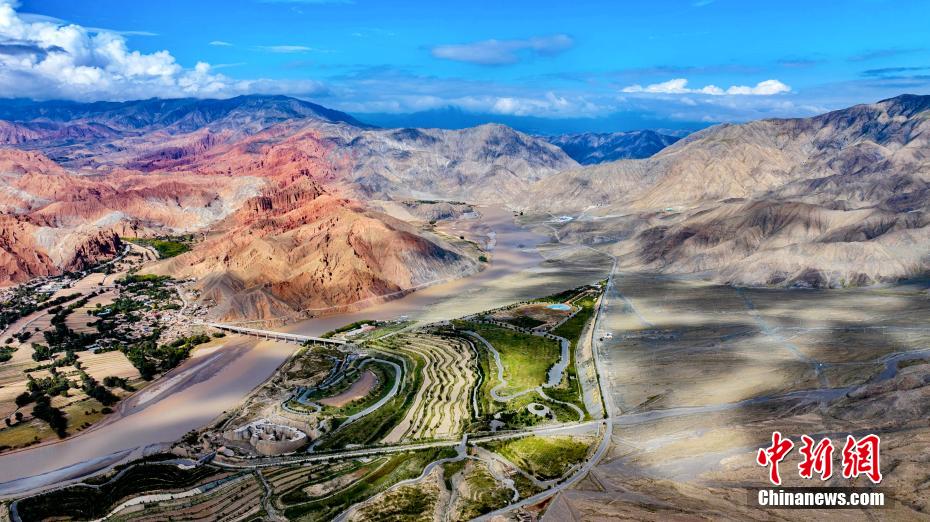 秋日高原,摄影爱好者在黄河上游的青海省海南藏族自治州贵德县境内,航拍贵德国家地质公园的阿什贡七彩峰丛地貌多姿多彩,秀丽壮美。画面中,天高云淡,山峦起伏,黄河在山川中蜿蜒,阿什贡七彩峰丛色彩斑斓,与天空云彩的倒影形成了一幅壮美的山川社稷图景。