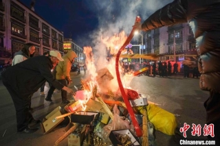 图为2月27日晚,吃完古突(一种藏式面食)后,拉萨市民在街头燃烧火把、燃放鞭炮等,迎接藏历新年的到来。中新社记者 江飞波 摄