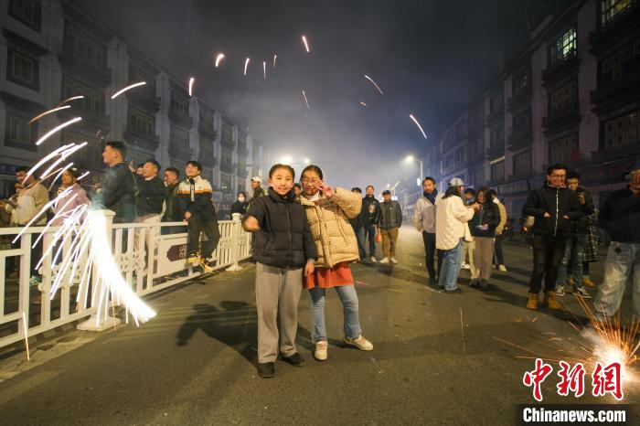 图为2月27日晚,孩子们在拉萨老城区街头燃放烟花,庆祝藏历新年的到来。中新社记者 江飞波 摄