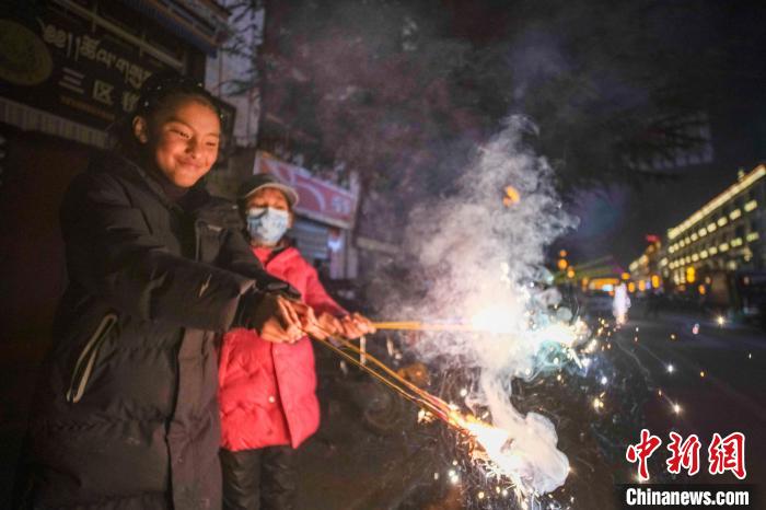 图为2月27日晚,孩子们在拉萨街头燃放烟花,庆祝藏历新年的到来。中新社记者 江飞波 摄