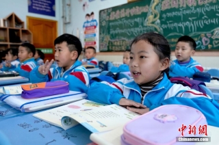 3月10日,拉萨市第一小学一年级八班学生们正在上藏语文课。中新社记者 李林 摄