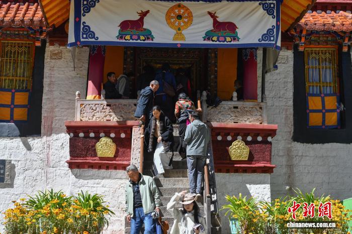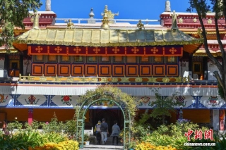 图为游客在罗布林卡内游览金色颇章。贡确 摄