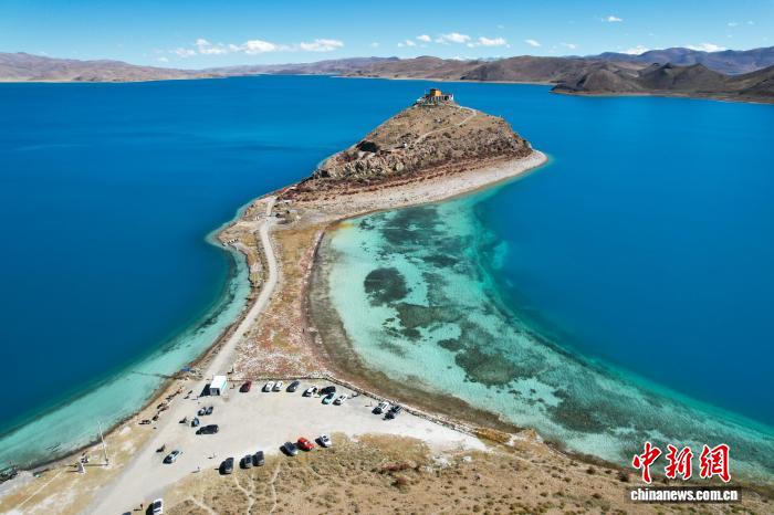 10月25日,西藏羊卓雍错日托寺风光。日托寺位于半岛上,形成了“古刹”“孤寺”景观,近年在网络平台持续火热。(无人机画面)中新社记者 江飞波 摄
