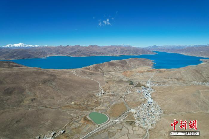 10月25日,西藏山南羊卓雍错东北岸东拉乡沿线风光,远处雪山皑皑。(无人机画面)中新社记者 江飞波 摄