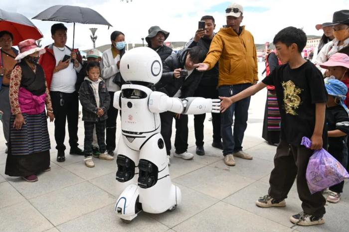 2025年9月6日,在西藏那曲市恰青赛马节现场,机器人的惊喜亮相,吸引前来观赛的民众与其互动。 中新社记者 贡嘎来松 摄