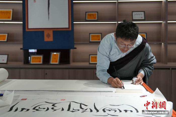 图为西藏乡村振兴产品展示中心内的藏文书法体验区。贡确 摄