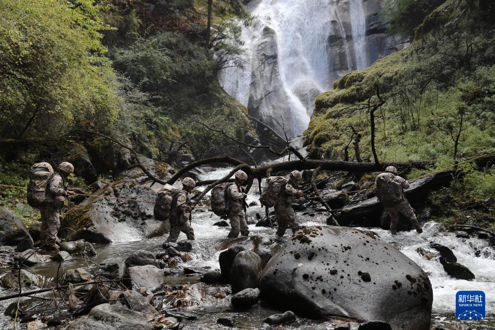 2025年11月2日,巡逻途中,西藏军区某团一级上士次罗布(右一)和战友们跋山涉水。新华社发(于达 摄)