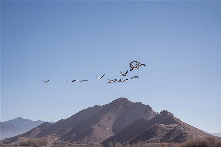 寒冬到来,雅江中游河谷黑颈鹤国家级自然保护区林周澎波区域迎来大批越冬黑颈鹤。作为国家一级保护动物、高原特有珍稀物种——黑颈鹤,2025年6月被正式评为拉萨市鸟,成为城市生态文化名片。它们在此驻足栖息、觅食嬉戏,勾勒出一幅人与生灵和谐共生的美好图景。林周县以制度护航、全民参与、科学管护等方式筑牢保护屏障,让“高原仙子”安稳越冬,用种群递增印证高原生态保护实效。