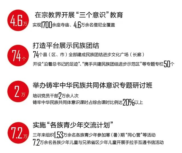 打造载体平台,创建工作有形有感有效。自治区党委党校举办全区铸牢中华民族共同体意识专题研讨班等各类班次200余期,培训党员干部2万余人次,铸牢中华民族共同体意识课时占综合课时比例达20%以上。开设“沿着总书记的足迹”、“携手共建民族团结进步示范区”等专题专栏50个。建成西藏百万农奴解放纪念馆、中华文化主题公园等视觉形象工程,74个县(区、市)全部建成民族团结进步文化广场(长廊),各类民族团结主题文艺作品350多部,深受各族群众欢迎和喜爱。实施“各族青少年交流计划”,三年来组织1.53万余名各族青少年参加寒(暑)期“同心营”、“民族团结我践行”、“石榴籽一家亲”等活动,7.2万余名各族少年儿童与兄弟省区少年儿童开展手拉手互通书信活动。目前,西藏全国民族团结进步示范单位达到91家,累计154个集体、204名个人荣获全国民族团结进步模范称号。