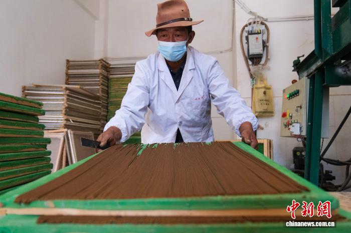 11月26日,西藏尼木县吞巴镇一藏香公司,54岁的农牧民嘎玛普琼正在使用机器生产藏香。中新社记者 江飞波 摄