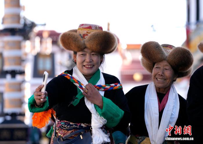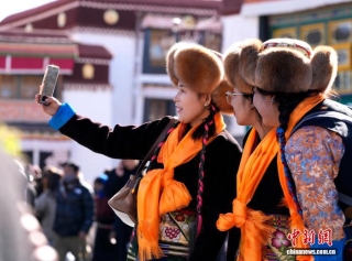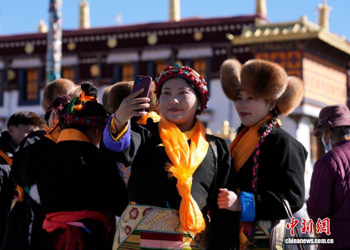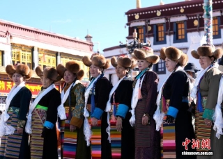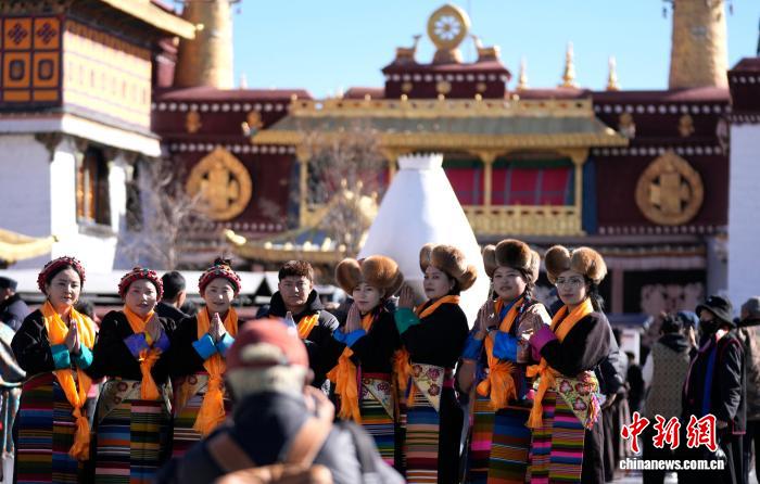 图为拉萨妇女盛装在大昭寺广场拍照。中新社记者 李林 摄