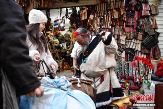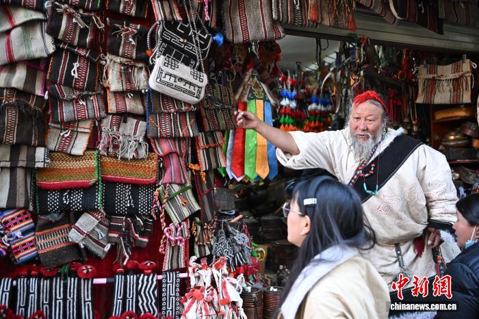 图为藏式老物件店主次仁罗布向游客推荐藏式氆氇侧挂包。中新社记者 贡嘎来松 摄