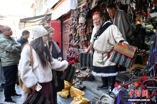 图为游客与藏式老物件店主次仁罗布议价。中新社记者 贡嘎来松 摄