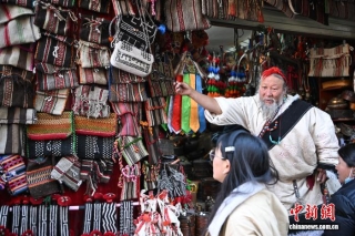 图为游客选购藏式氆氇侧挂包。中新社记者 贡嘎来松 摄