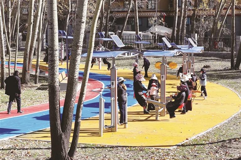 南区聚焦“活力运动”功能,打造出多元化运动场地集群,环形健身步道嵌入AI互动夜光百米跑道,让运动体验充满趣味性与科技感;7人制足球场采用抗高原风雪、防紫外线的张拉膜设计,创下西藏钢结构跨度之最,与网球场、篮球场、羽毛球场共同满足市民的竞技运动需求;儿童活动广场按年龄段精细划分功能区域,配备滑梯、攀爬乐园等设施,10套太阳能智慧健身器材全天候开放,全面覆盖全年龄段人群的健身需求。此外,智能健身广场、AI运动场等设施的投用,也让市民在科技赋能中畅享运动乐趣。