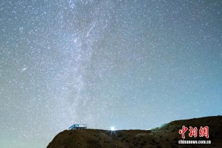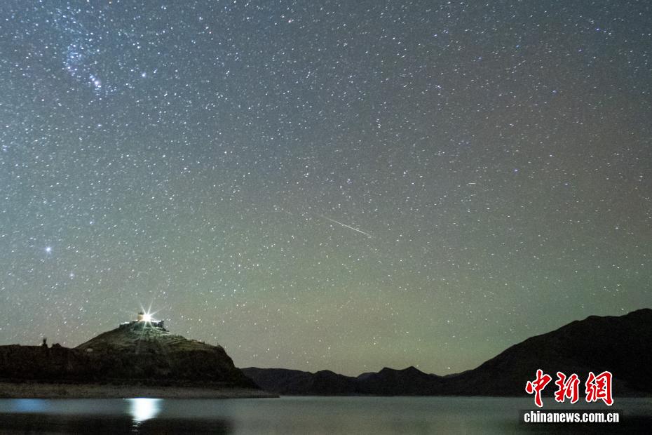 图为13日深夜,一颗流星划过西藏羊湖日托寺附近。中新社记者 江飞波 摄