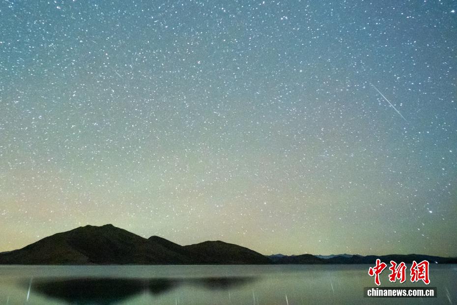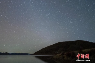 图为13日深夜,一颗流星划过西藏羊湖上空。中新社记者 江飞波 摄