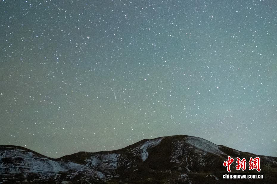 图为14日凌晨,一颗流星划过西藏羊湖附近的雪山上空。中新社记者 江飞波 摄