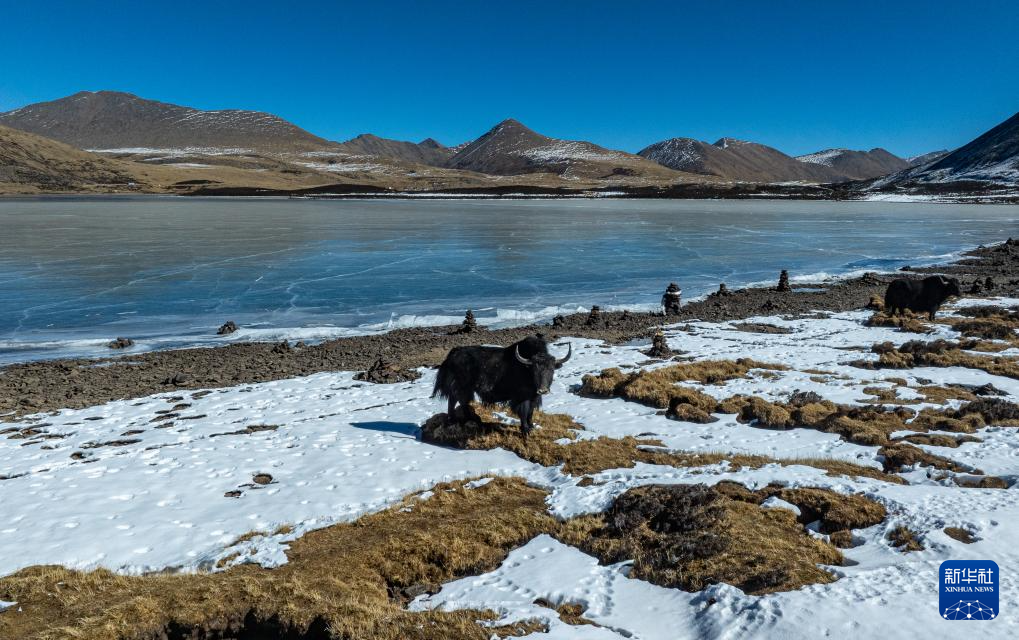 12月13日,牦牛驻足在思金拉错湖岸(无人机照片)。新华社记者 丁增尼达 摄