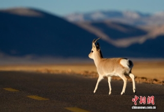 图为藏原羚穿过公路。中新社记者 李林 摄
