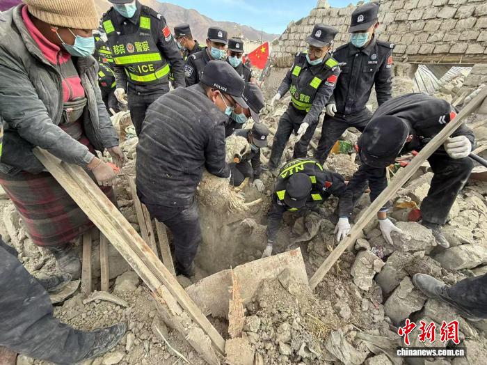 图为定日地震发生后民警救援村民被埋的羊羔。日喀则边境管理支队供图