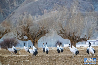 近日,一群黑颈鹤在西藏日喀则市南木林县的雅江河畔田间觅食,神态悠闲,惹人神往。黑颈鹤是国家一级保护动物,主要栖息在海拔2500米至5000米的高原草甸、沼泽地带。