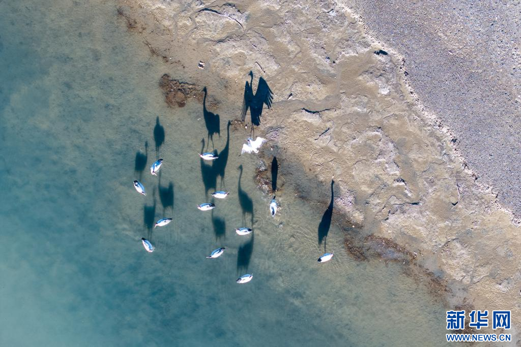 12月19日,在西藏日喀则市南木林县的雅鲁藏布江河畔拍摄的黑颈鹤(无人机照片)。新华网 旦增努布 摄