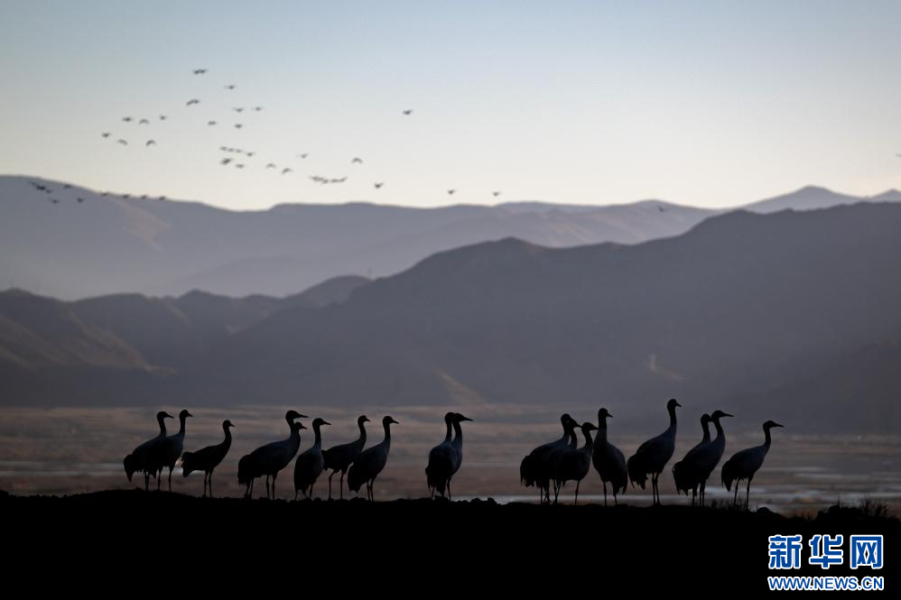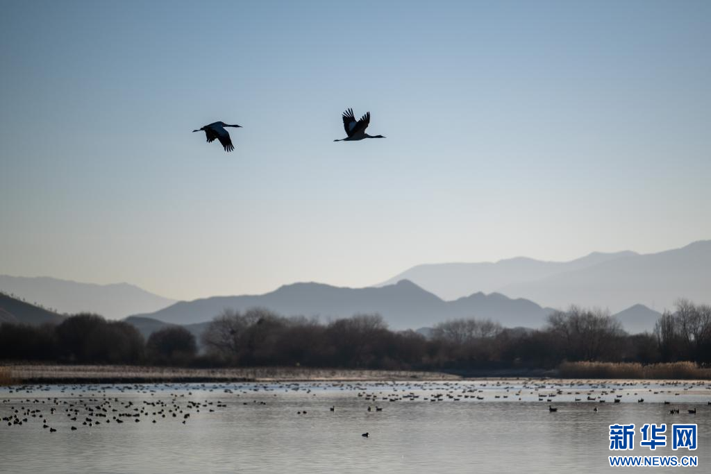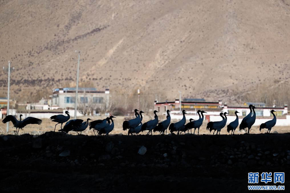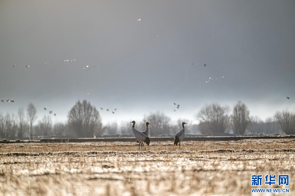12月18日,在西藏日喀则市南木林县境内拍摄的黑颈鹤。新华网 旦增努布 摄