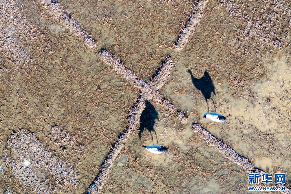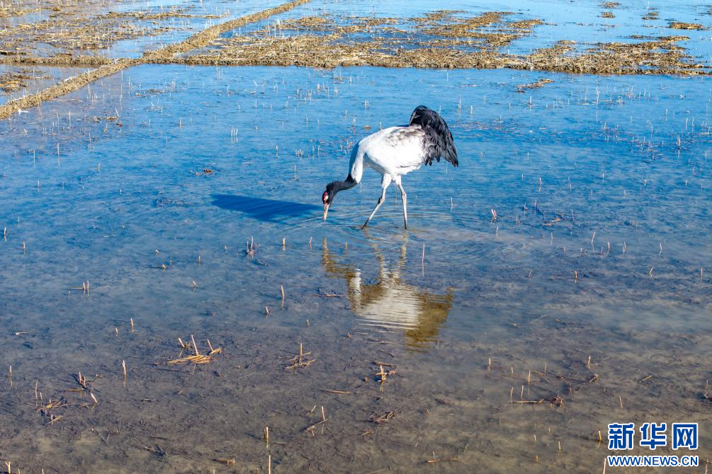 12月18日,在西藏日喀则市南木林县田间觅食的黑颈鹤。新华网 旦增努布 摄