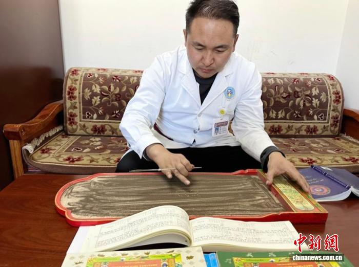 图为西藏自治区藏医院天文历算研究中心的多杰正在沙盘上演算。李海霞 摄