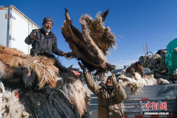 12月15日,西藏自治区那曲市第十八届畜产品展销会上,牧民在整理待售的羊皮。江飞波 摄