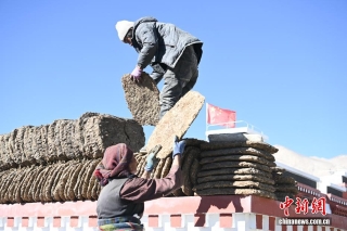 图为重建后的森嘎村村民在自家的新房围墙上摆放干牛粪。中新社记者 贡嘎来松 摄