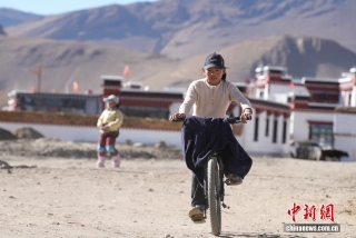图为森嘎村的一个女孩在自家新房前骑自行车。中新社记者 贡嘎来松 摄
