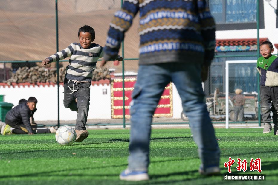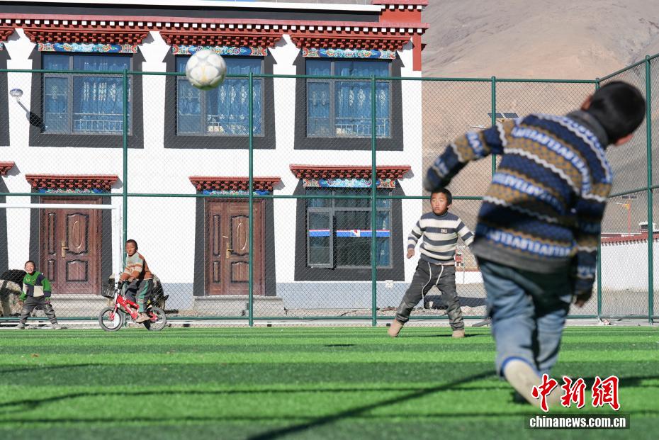 图为森嘎村的孩子们在踢足球。中新社记者 贡嘎来松 摄