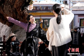 12月24日,游客在拉萨市八廓街拍摄藏服写真。中新社记者 李林 摄