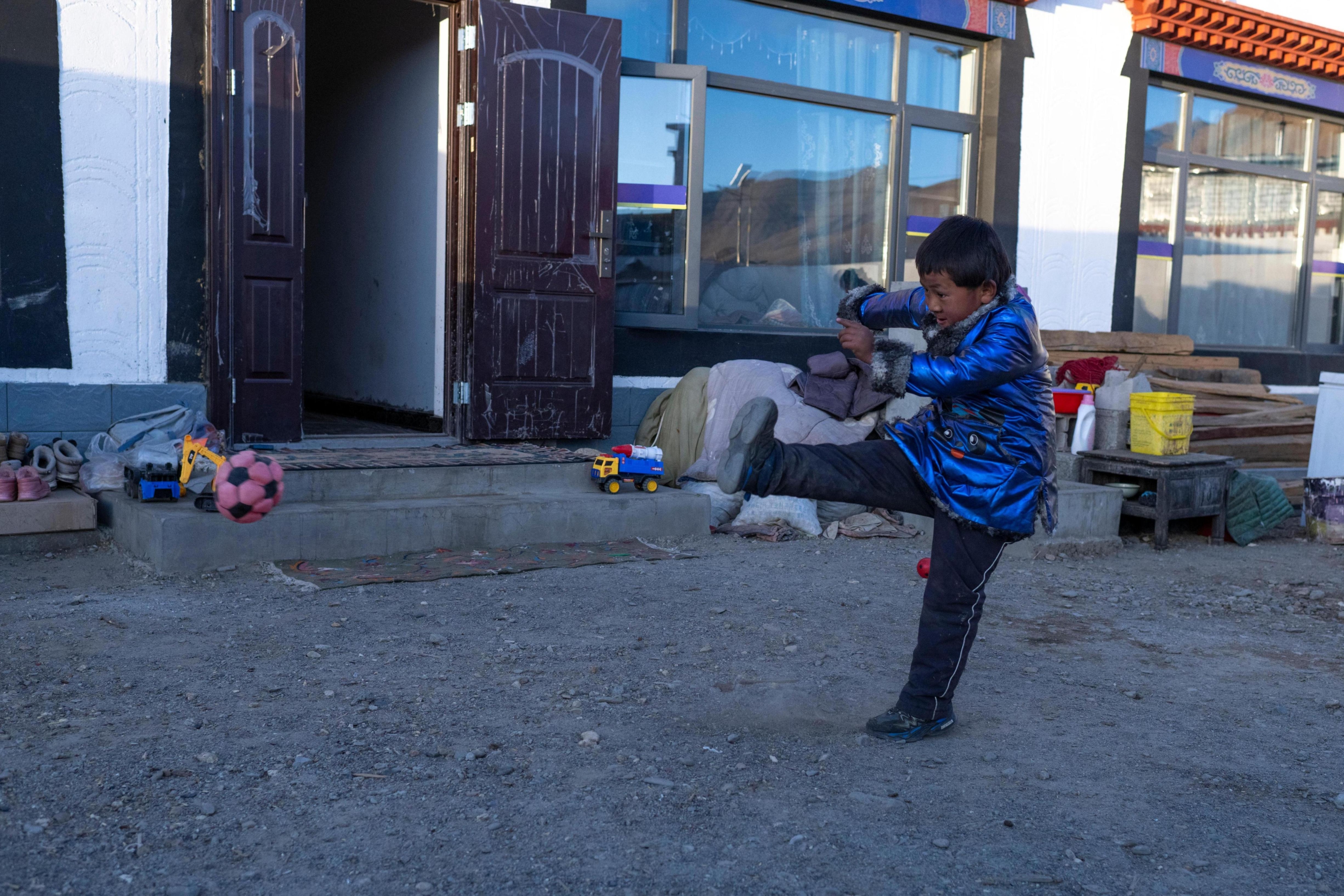 次仁普尺的弟弟在院子里玩耍。人民网记者 翁奇羽摄