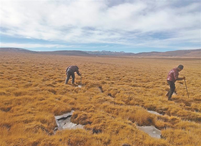 图为聂荣县查当乡玛布村生态管护员正在敲碎草原上的冰层。迟巴加 提供