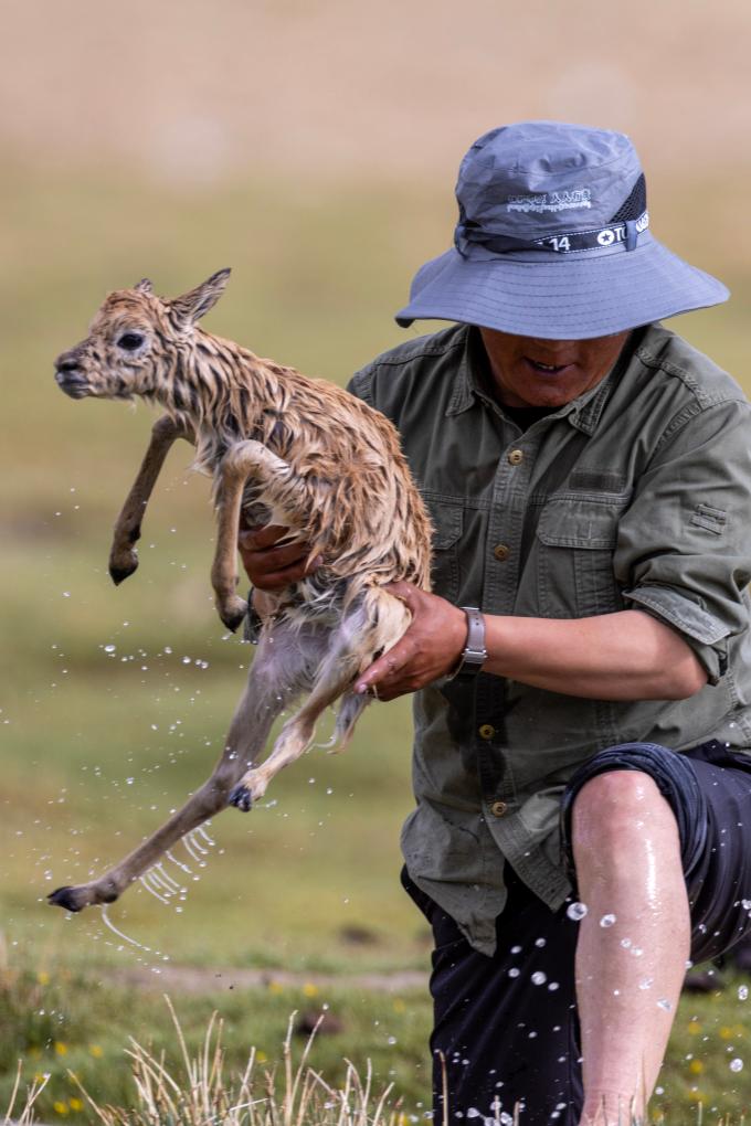 管护队员次旺在救助一只被急流冲走的藏羚羊幼崽(2025年7月14日摄)。