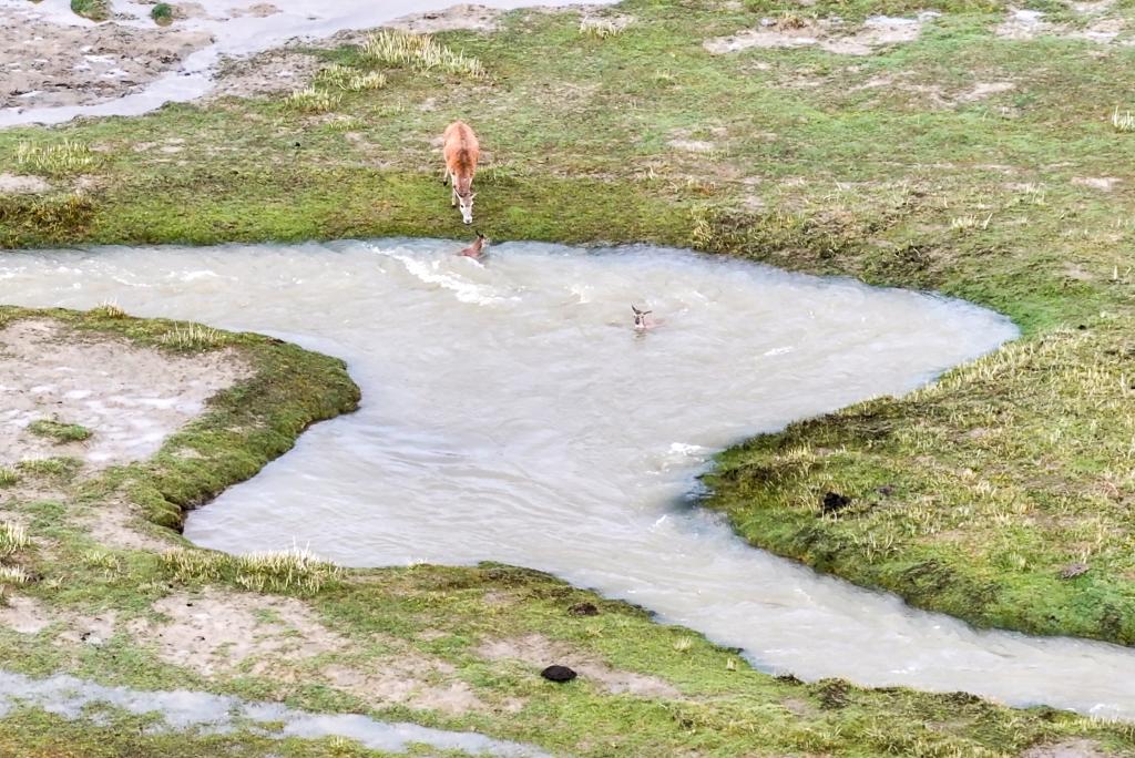 森隆藏布河最窄处仅有一米宽,但水流湍急,刚出生不久的藏羚羊幼崽过河前,需母羊反复测试路线,引导幼崽在合适的位置跳跃或趟水渡河。