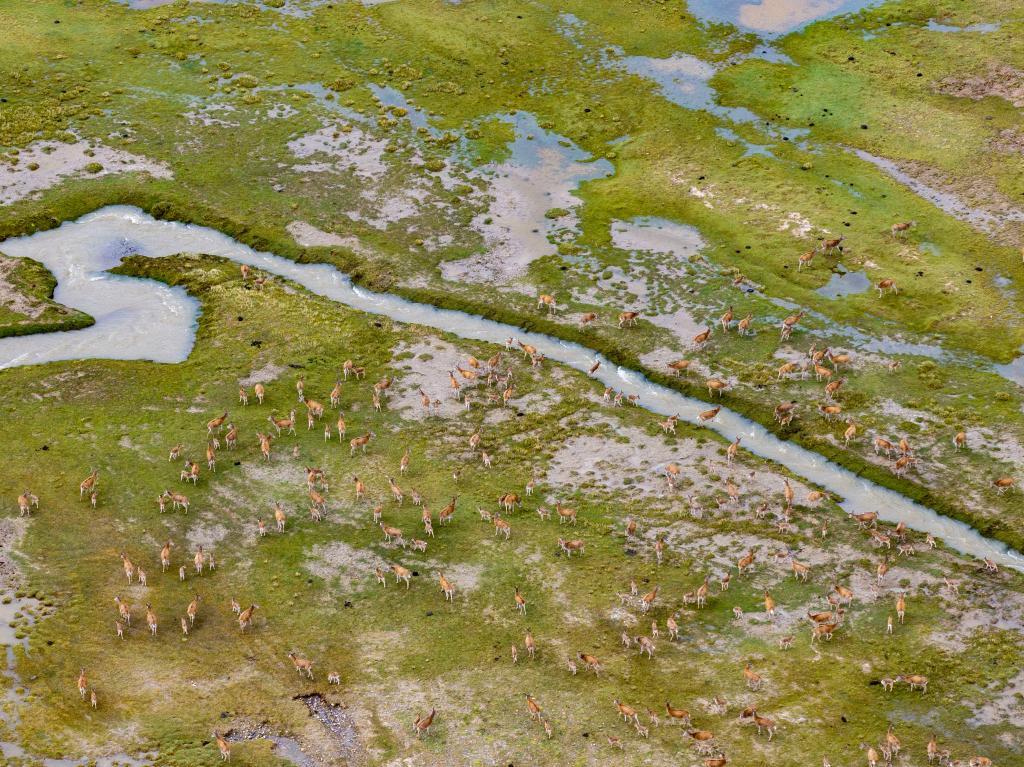 大批带着幼崽的藏羚羊,聚集在森隆藏布河岸边过河(2025年7月14日摄)。