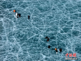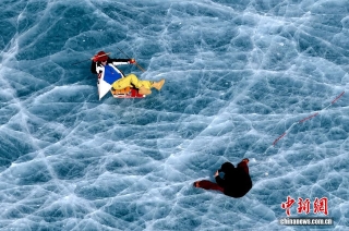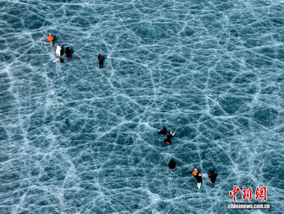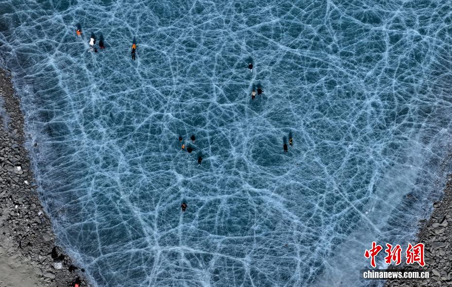 1月16日,游客在琼穆岗嘎雪山脚下的冰湖拍照。中新社记者 李林 摄