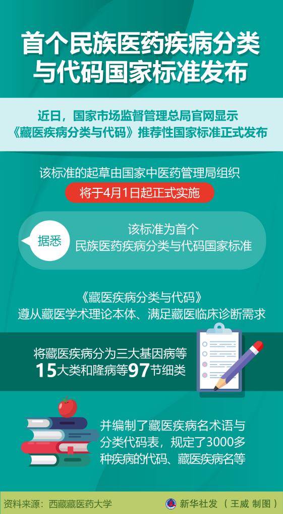 近日,国家市场监督管理总局官网显示《藏医疾病分类与代码》推荐性国家标准正式发布。记者从参与起草的西藏藏医药大学了解到,该标准的起草由国家中医药管理局组织,将于4月1日起正式实施。据悉,该标准为首个民族医药疾病分类与代码国家标准。