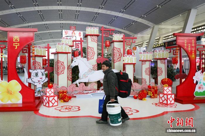 2月2日,旅客从西宁火车站装扮的马年氛围装饰区前走过。马铭言 摄