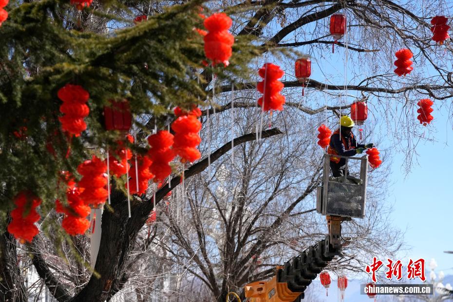 2月3日,西藏拉萨,工人正在挂灯笼。中新社记者 李林 摄