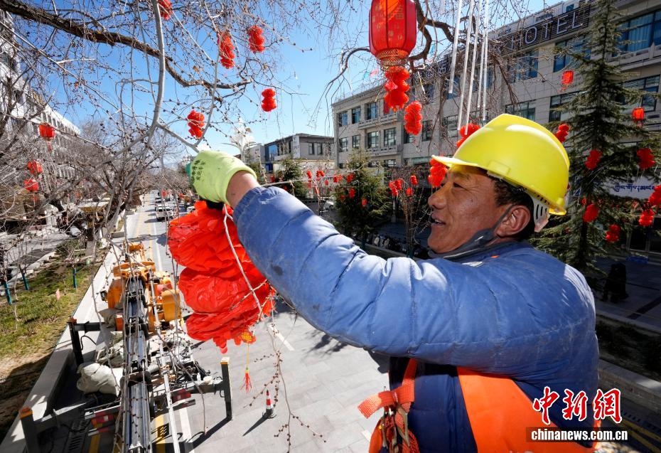 2月3日,西藏拉萨,工人沙吉顿珠正在挂灯笼。中新社记者 李林 摄