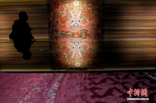 图为观众拍摄展览中的香色地彩云金龙暗八仙纹绒绣织成料。中新社记者 李林 摄