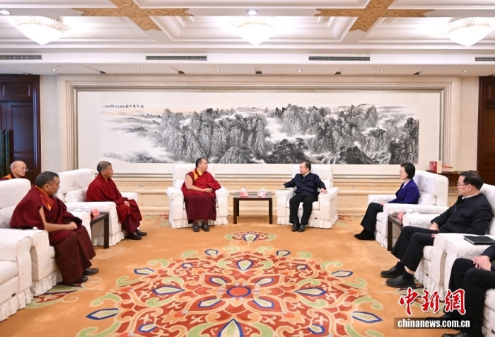 2月12日,中共中央政治局委员、中央统战部部长李干杰在北京会见了班禅额尔德尼·确吉杰布。中新社记者 赵文宇 摄