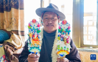 2月12日,在拉萨市林廓东路,来自西藏日喀则市仁布县普松乡的手工艺人罗布展示做好的酥油花。新华社记者 丁增尼达 摄